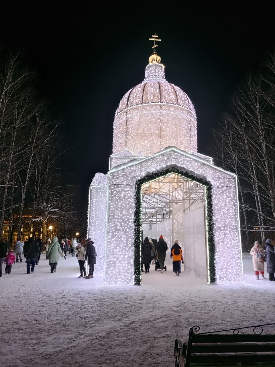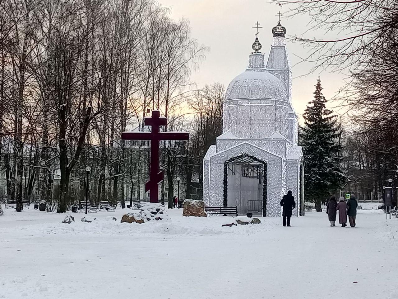 Здесь же на площади самая главная световая инсталляция «Храм» в честь Спасского собора, разрушенного большевиками в 1930г. Рядом есть стенд, где все рассказывается об этом соборе. На этом месте, где у нас теперь каждую зиму ставят инсталляцию «Храм» был собор, сама инсталляция является точной копией собора, уменьшенная в три раза.
