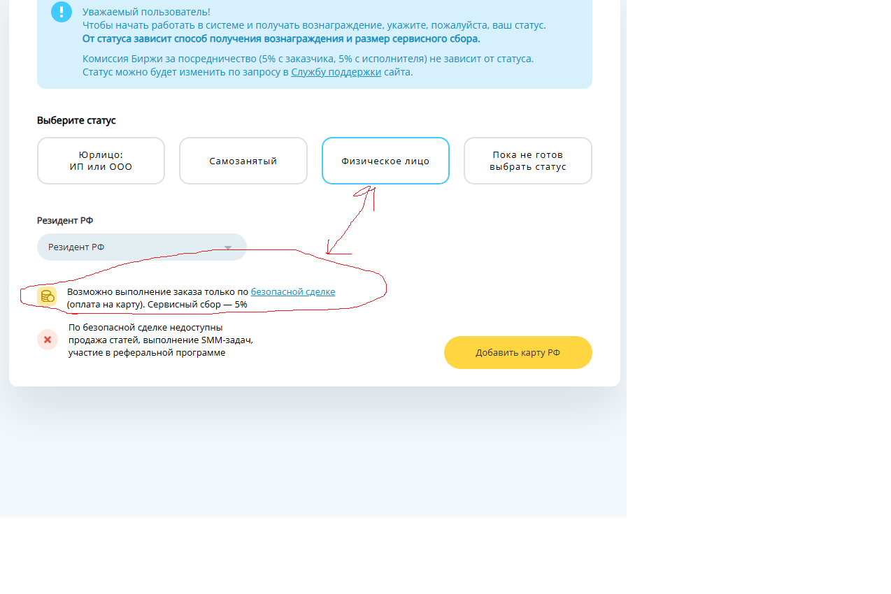 И вот тут-то и вылезает один неприятный момент, если вы не являетесь самозанятым. Вы можете зарегистрироваться как физическое лицо, но в этом случае не все заказы будут доступны. Там есть оплата сразу на банковскую карту, если сам заказчик поддерживает подобный способ расчета. И именно только такие заказы и будут доступны. Сразу скажу, что таких заказов не так уж много. Может быть, это только пока, потом таких способов расчета между заказчиками и исполнителями будет больше, но сейчас не так много.