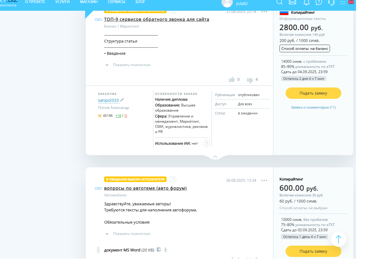 И именно это я считаю большим недостатком на бирже. Так как если вы не являетесь самозанятым, новичок на бирже, да не только на бирже, но и в сфере копирайтинга, то, думаю, набраться опыта в этом случае будет непросто. Так как помимо того, что первые заказы недорогие, новичок еще не все понимает в работе, найти первые заказы и первых заказчиков нелегко, а тут еще доступны только те, которые оплачиваются на банковскую карту.